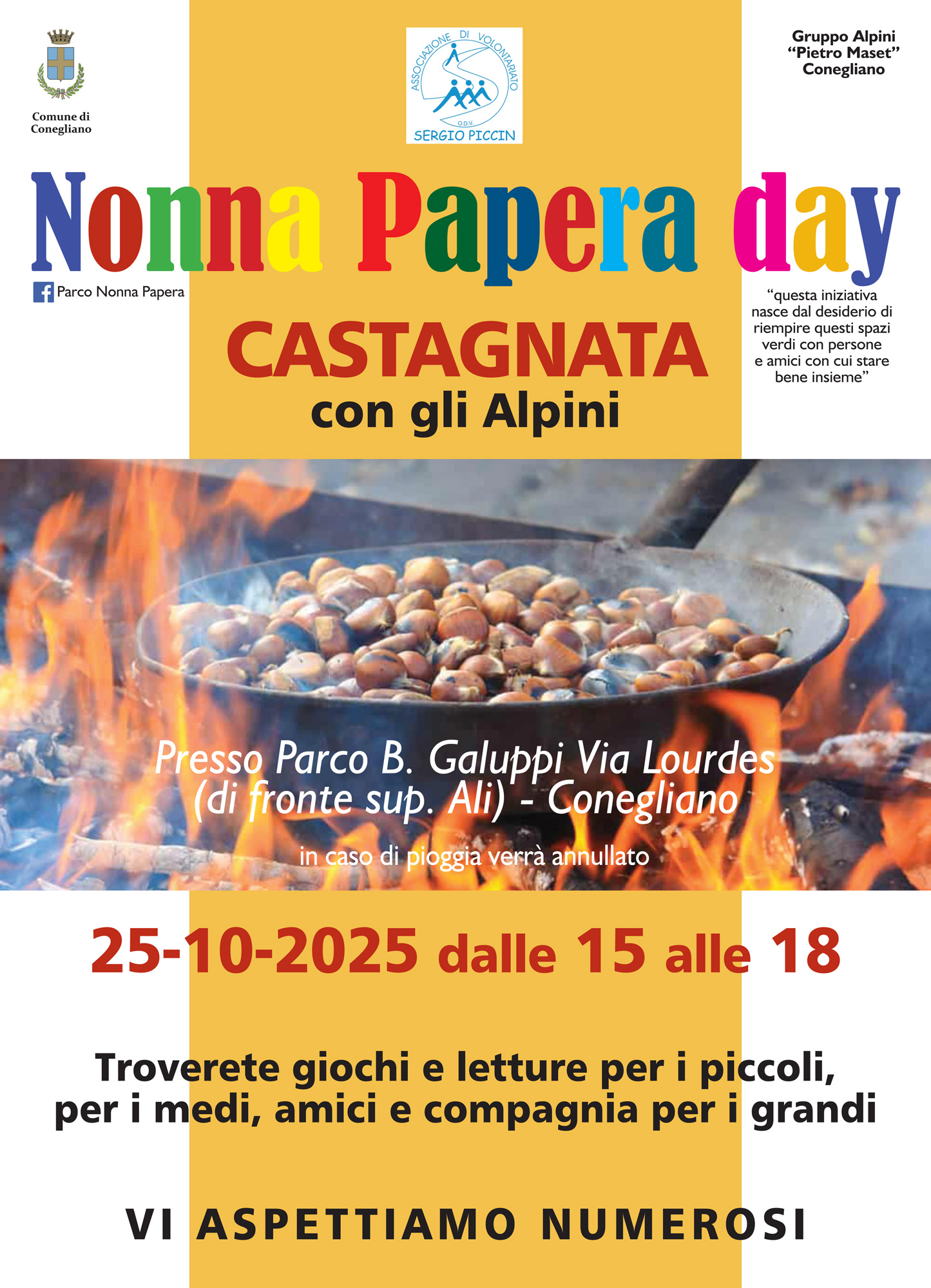 Il 25 Ottobre 2025 dalle 15,00 alle 18,00 non prendere altri impegni … è Nonna Papera Day“!!! Una grande CASTAGNATA con gli alpini del Gruppo M.O. Pietro Maset presso il parco comunale B. Galuppi di Conegliano in Via Lourdes 145 ! Clicca qui per maggiori informazioni e la locandina! Vi attendiamo numerosissimi!!!!